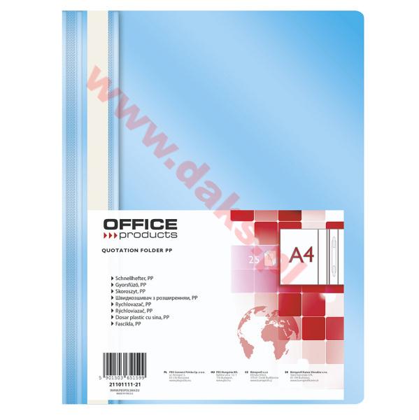- Skoroszyt miękki PP OFFICE PRODUCTS - A4/jasno-niebieski/(25szt.)Skoroszyt miękki PP OFFICE PRODUCTS * ekonomiczny * miękki * polipropylenowy * niewpinany do segregatora * w kolorze jasno-niebieskim * strona przednia przeźroczysta - grubość PP - 100?m; strona tylna kolorowa - grubość 150?m * mieszczący ok. 200 kartek * możliwość dwustronnego opisu * na pasku brzegowym kieszonka umożliwiająca wymianę paska * format A4 * wymiary: 225x305mm * w opakowaniu 25 sztuk * jednostka sprzedaży : 1 opakowanie