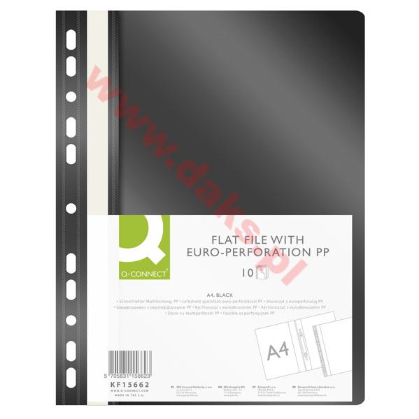 - Skoroszyt wpinany do segregatora-miękki PP Q-CONNECT - A4/czarny/(10szt).Skoroszyt wpinany do segregatora-miękki PP Q-CONNECT * wpinany do segregatora * w kolorze czarnym * strona przednia przeźroczysta - grubość 120?m; strona tylna kolorowa - grubość 180?m * mieszczący ok. 200 kartek * możliwość dwustronnego opisu na pasku brzegowym * kieszonka umożliwiająca wymianę paska posiada 11 dziurek do wpięcia * format A4 * wymiary: 225x305mm ** w opakowaniu 10 sztuk * jednostka sprzedaży :1 opakowanie