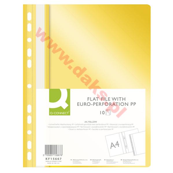 - Skoroszyt wpinany do segregatora-miękki PP Q-CONNECT - A4/żółty(10szt).Skoroszyt wpinany do segregatora-miękki PP Q-CONNECT * wpinany do segregatora * w kolorze żółtym * strona przednia przeźroczysta - grubość 120?m; strona tylna kolorowa - grubość 180?m * mieszczący ok. 200 kartek * możliwość dwustronnego opisu na pasku brzegowym * kieszonka umożliwiająca wymianę paska posiada 11 dziurek do wpięcia * format A4 * wymiary: 225x305mm ** w opakowaniu 10 sztuk * jednostka sprzedaży :1 opakowanie