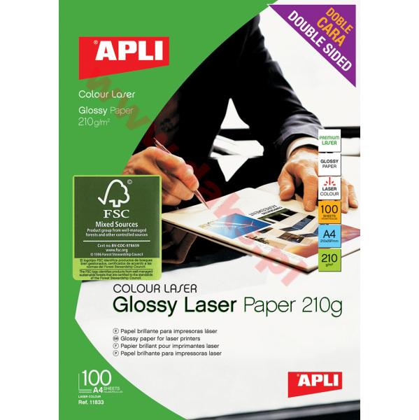 Papier fotograficzny A4 APLI do drukarek laserowych - 210gm2/błyszczący/(100)Papier fotograficzny APLI do drukarek laserowych 210g/błyszczący * do drukowania projektów, wykresów, prezentacji, itp. na drukarkach laserowych * błyszczący, biały * możliwość dwustronnego zadruku * format A4 * gramatura: 210 g/m2 * posiada certyfikat FSC * w opakowaniu 100 arkuszy * jednostka sprzedaży: 1 opakowanie